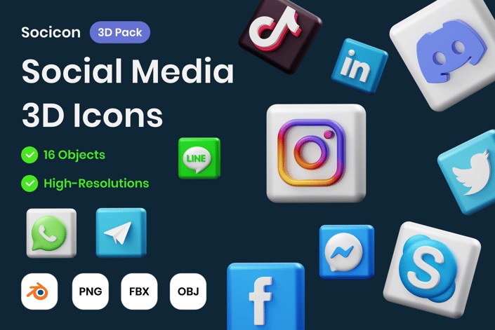 آبجکت سهبعدی رسانههای اجتماعی ۱۶ شیء آماده برای فایلهای تصویرسازی سهبعدی رسانههای اجتماعی برای وبسایتها، برنامههای موبایل و موارد دیگر. طرحهای خود را با داراییهای سهبعدی بهبود بخشید.