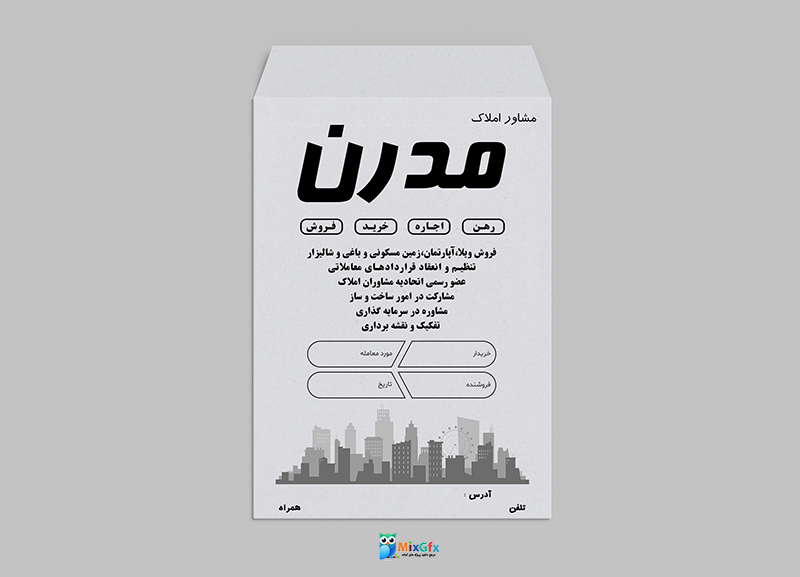 طرح پاکت قرارداد املاک با فرمت PSD لایه باز و قابل ویرایش در نرمافزار فتوشاپ طراحی شده است. این فایل شامل آیتمهای با کیفیت و مطابق با استانداردهای چاپ است و تمام موارد مهم مانند رنگبندی، حاشیهها، فاصلهها، سایز و نوع فونت رعایت شدهاند. شما میتوانید این فایل را بصورت کاملا رایگان از سایت میکس جی اف ایکس دانلود نمایید .