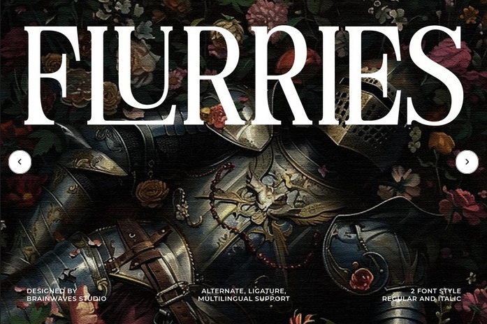 Flurries یک فونت مدرن سریف است که تعادل کاملی بین جسارت و ظرافت برقرار می‌کند. چه برای برندهای لوکس طراحی کنید، چه تیترهای برجسته ایجاد کنید، یا جلوه‌ای منحصر به فرد به لوگوهای خود اضافه کنید، Flurries شما را پوشش می‌دهد.