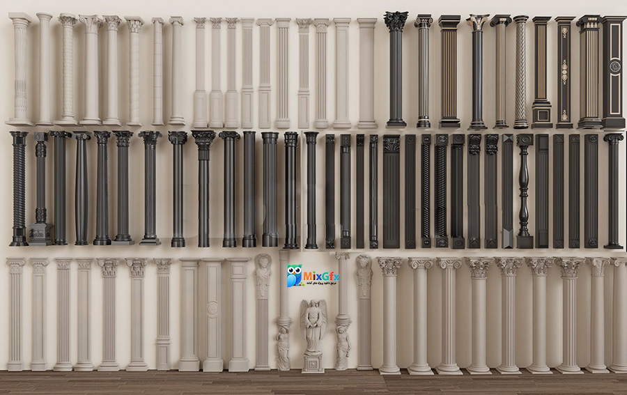 مجموعه ستون های تزئینی ساختمان شامل آبجکت های با کیفیت بسیار بالا از تزئینات رومی و کلاسیک میباشد. که دارای تعداد زیاد مدل مختلف میباشد و تقریبا تمامی آبجکت های مورد نیاز در طراحی انواع نماهای کلاسیک و کلاسیک از قبیل : انواع آبجکت ستون اصلی در طراحی انواع نما رومی و کلاسیک را دارا میباشد .