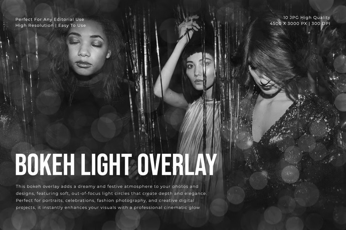 مجموعهای از پوششهای نور بوکه رویایی که برای ارتقای فوری جلوههای بصری شما با درخشش و ظرافت سینمایی طراحی شدهاند. این پوششها با داشتن دایرههای نوری نرم و خارج از فوکوس، به عکسها و طرحهای شما عمق و فضا میبخشند. این بسته که برای پرتره، جشنها، عکاسی مد، آثار هنری دیجیتال خلاقانه و پروژههای ویرایشی ایدهآل است، پوششهایی با وضوح بالا را برای چاپ و استفاده در وب ارائه میدهد.