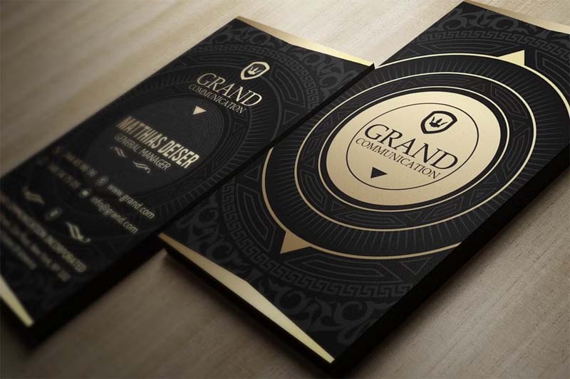 کارت ویزیت افقی با لوگوی مشکی و طلایی و بکگراند شیک و زیبا میباشد . این کارت ویزیت افقی شیک برای متخصصان شرکتها، صاحبان مشاغل کوچک، فریلنسرها و مشاورانی که ظاهری جسورانه و مدرن میخواهند طراحی شده است. روی کارت یک پسزمینه مشکی جذاب با فونتهای طلایی و سفید دارد که لوگوی شرکت، نام و عنوان یا نام تجاری شما را در یک طرحبندی حرفهای و واضح برجسته میکند.